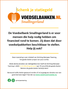 Al Jaren ondersteunt de stichting Maripaan de Voedselbank Smallingerland. Minstens twee keer per jaar kan onze Voedselbank met hulp van beide filialen van Jumbo in Drachten een winkelactie houden. Deze winkelacties leveren altijd veel producten op. Op 12 en 13 December zijn er weer winkelacties in Jumbo de Drait en Jumbo Stationsweg.