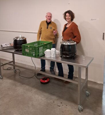 Ruud aan het woord gezellig kletsen metelkaar Piet en Ellen bij de snertuitdeling